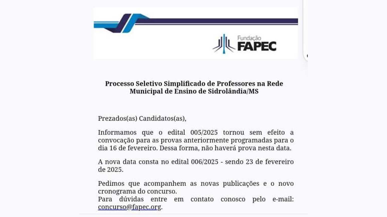 A Prefeitura de Sidrolândia anuncia a reabertura das inscrições para o processo seletivo destinado ao recrutamento de professores temporários. As inscrições, prorrogadas até segunda-feira, às 13 horas, horário oficial de Mato Grosso do Sul, devem ser realizadas exclusivamente online pelo endereço eletrônico da Fundação Fapec.