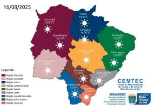 Já nas regiões do bolsão, leste e norte, os termômetros devem registrar mínimas entre 11 e 15°C e máximas até 36°C. Em Campo Grande são previstas mínimas entre 14 e 22°C e máximas entre 29 e 33°C.