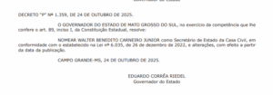 Com a saída, o cargo passa a ser ocupado por Walter Benedito Carneiro Júnior, ex-presidente da Sanesul e até então secretário adjunto da pasta. Carneiro, que concorreu a deputado federal nas últimas eleições e ficou como suplente, passa agora a integrar o primeiro escalão do governo.