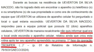 Ainda segundo o Gaeco, os agentes alertaram Ueverton a entregar os aparelhos, para cumprimento da ordem judicial de busca e apreensão. Então, o Gaeco afirmou que não conseguiu localizar os aparelhos: “A despeito da minuciosa varredura realizada no imóvel pelos policiais, não foi possível encontrar o telefone celular“.