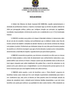 Em nota divulgada pela seccional de Mato Grosso do Sul da Ordem dos Músicos do Brasil (OMB/MS), atribui a demissão do maestro Carlos Alberto, logo após o período eleitoral, à uma perseguição política. Confira na íntegra abaixo: