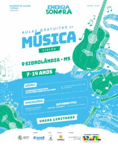 As oficinas gratuitas incluem percussão e violão, com fornecimento de instrumentos, materiais didáticos, uniformes e lanches para todos os participantes. As atividades serão realizadas na Fundação Municipal de Cultura (Casa da Cultura), localizada na Avenida Antero Lemes da Silva, s/n – Bairro Sol Nascente e também no local Banda Municipal, localizado na Rua Vicente De Brito, 313 – Jardim Alfa. Para saber mais pode ir diretamente na Casa da Cultura ou pelo telefone (67) 99264-7713, com Simone Gimenes, assistente de coordenação do projeto em Sidrolândia.