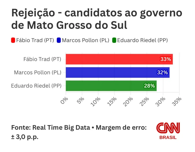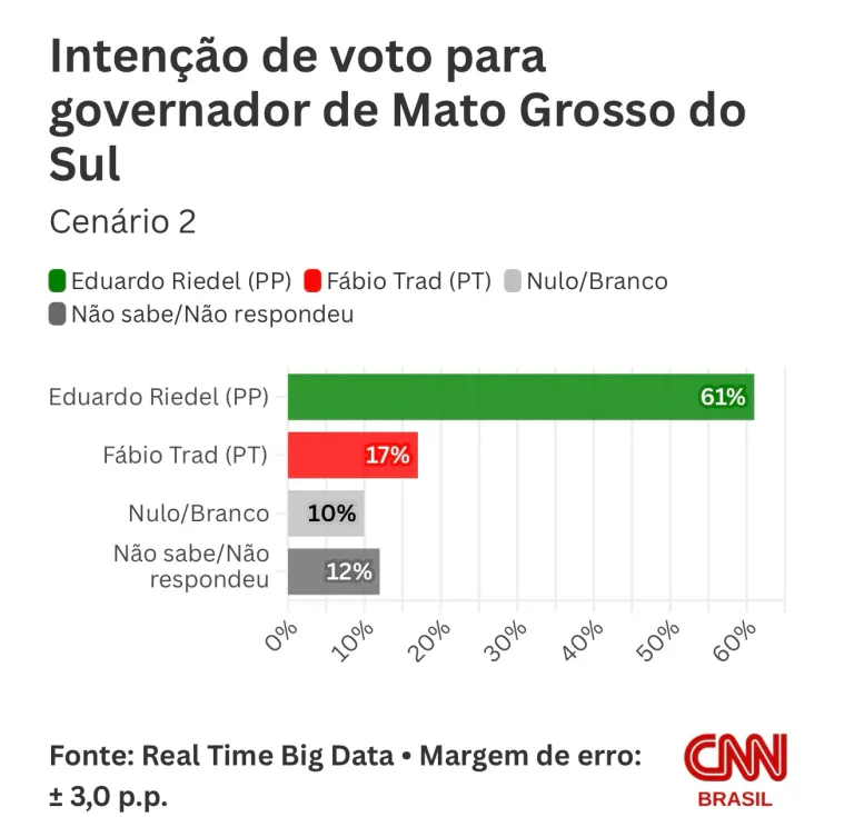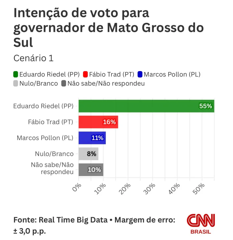 Nova pesquisa, divulgada nesta segunda-feira (01) pelo Instituto Real Time Big Data, aponta o governador Eduardo Riedel (PP) na liderança na busca pela reeleição. No primeiro cenário, o governador lidera com 55%, seguido por Fábio Trad (PT), com 16%; e Marcos Pollon (PL), 11%. Outros 10% não sabem ou não responderam e 8% declararam voto nulo ou branco.