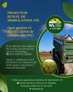 Um sorteio promovido pela WA Comércio, Transporte e Corretora de Cereais vai contemplar produtores rurais com PIX no valor de 12 toneladas de calcário, insumo fundamental para a correção da acidez do solo e aumento da produtividade.