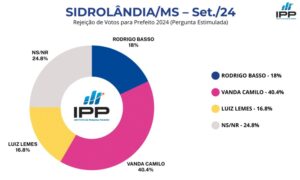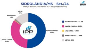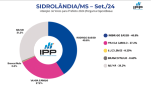 O candidato Rodrigo Basso (PL) lidera a corrida pela Prefeitura de Sidrolândia (MS), mostra a pesquisa realizada pelo Instituto de Pesquisa Pinheiro (IPP), encomendada pelo MS Notícias, divulgada neste sábado (21.set.24).