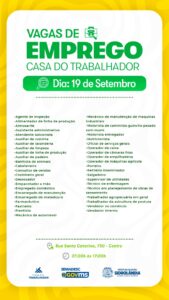 A sexta-feira (19) em Sidrolândia tem a oportunidade de mais de 45 vagas de emprego, em diversas áreas de trabalho, como cabeleireiro, salgadeiro, motorista, porteiro, empregado doméstico, entre outras.