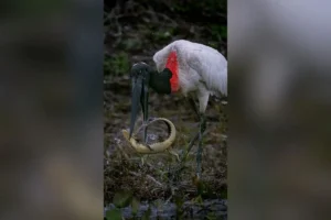 Uma cena rara e impressionante registrada pelo fotógrafo internacional Masanori Yamaguchi mostra o momento em que um tuiuiú captura um filhote de jacaré, no Pantanal de Mato Grosso do Sul. O vídeo foi gravado próximo ao Refúgio da Ilha, na região do Rio Salobra.